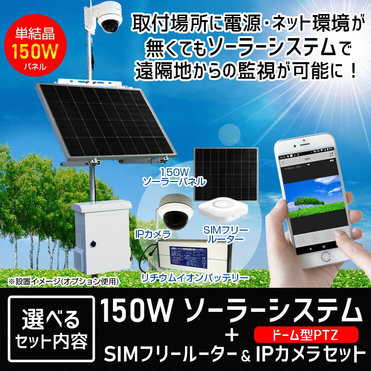 防犯カメラ 《 150Wソーラーパネル リチウムイオンバッテリー SIMフリールーター PTZ(パン・チルト・ズーム)対応ワイヤレスIPカメラ セット 》ソーラーシステム ソーラー 太陽光パネル 太陽光 遠隔監視 監視カメラ 単結晶ソーラーパネル【送料無料】